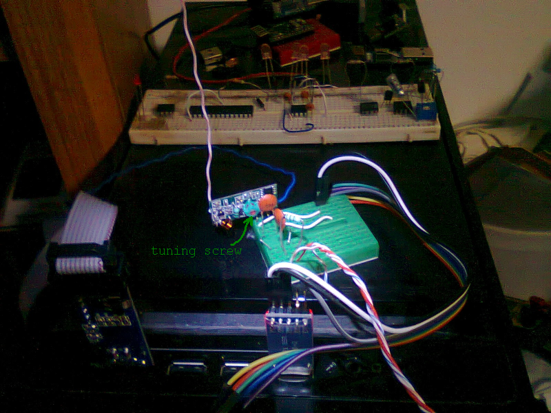 I plugged the audio jack into my computer line-in and configured it to play the audio from line-in. A set of external speakers with a 3.5mm audio jack would work just as well. I adjusted the tuning screw until I could clearly hear the 3.3kHz tone. I then took the transmitter (on a small breadboard with battery power) around the house, and outside. With the transmitter on top of my car in the driveway some 10-12m away, I could still clearly hear the tone (with a bit of static).
