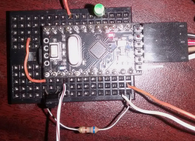As shown in the very first photo, I used a mini-breadboard with the 8-pin ATtiny positioned so that the Pro Mini will plug in with its raw input at the far right. In the photo I have extra wires connected for debugging. The only required ones are as follows:
